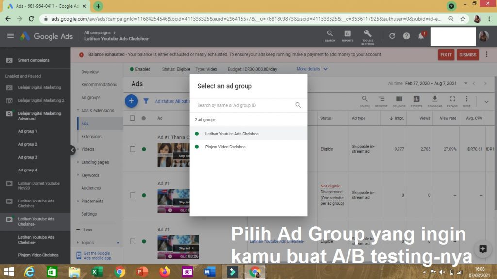 1. Pergi ke campaign youtube ads yang ingin kamu buat A/B testing nya. Kemudian, pergi lah ke bagian AD GROUPS.