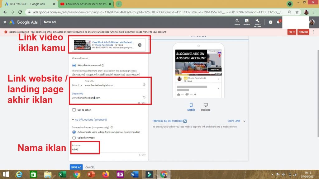 4. Kemudian, susun lah LINK VIDEO YANG INGIN KAMU IKLAN – KAN, WEBSITE / LANDING PAGE, dan NAMA IKLAN (AD NAME)