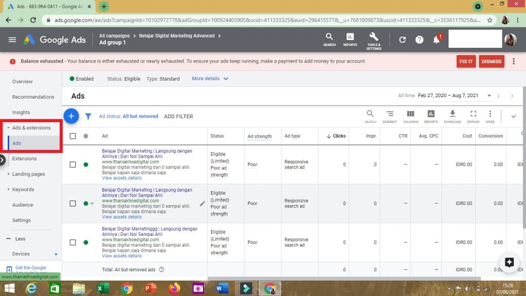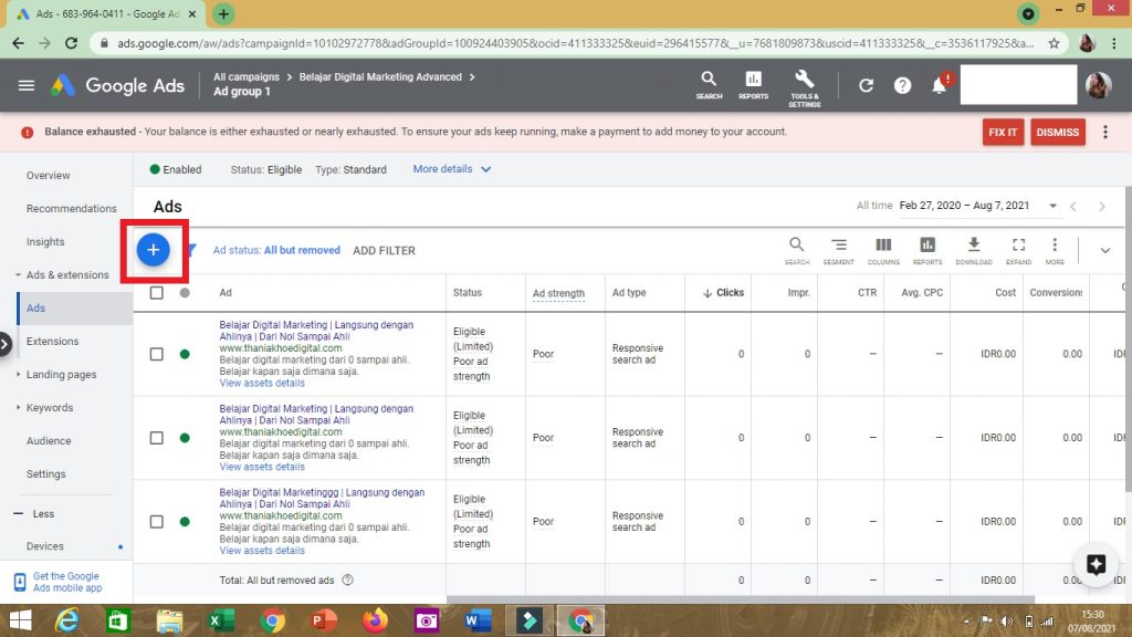 2. Setelah campaign nya telah jadi, klik lah di bagian ADS (di bawah tulisan Ads & Extensions), lalu klik tanda plus (+)