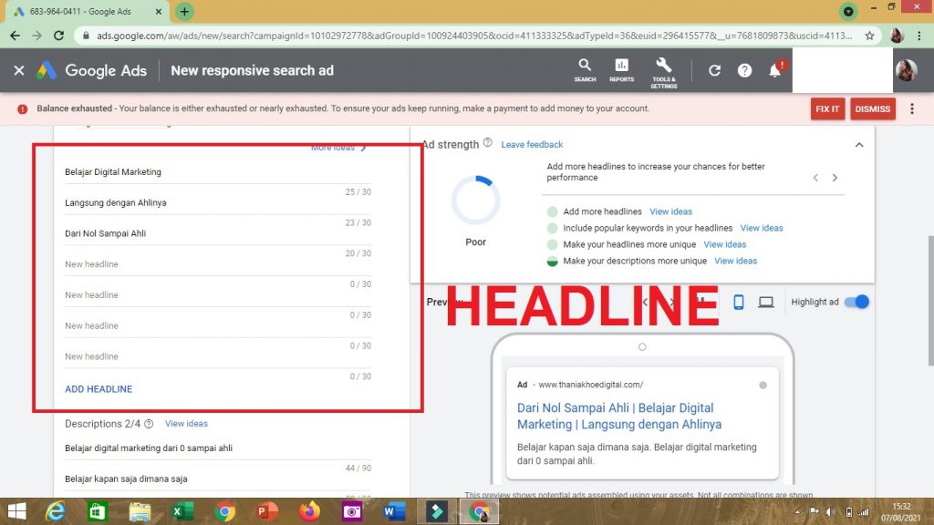 5. Nah, setelahnya, kamu bisa membuat Ad Copy (naskah teks iklan) yang berbeda. Pertama, kamu bisa membuat HEADLINE yang berbeda