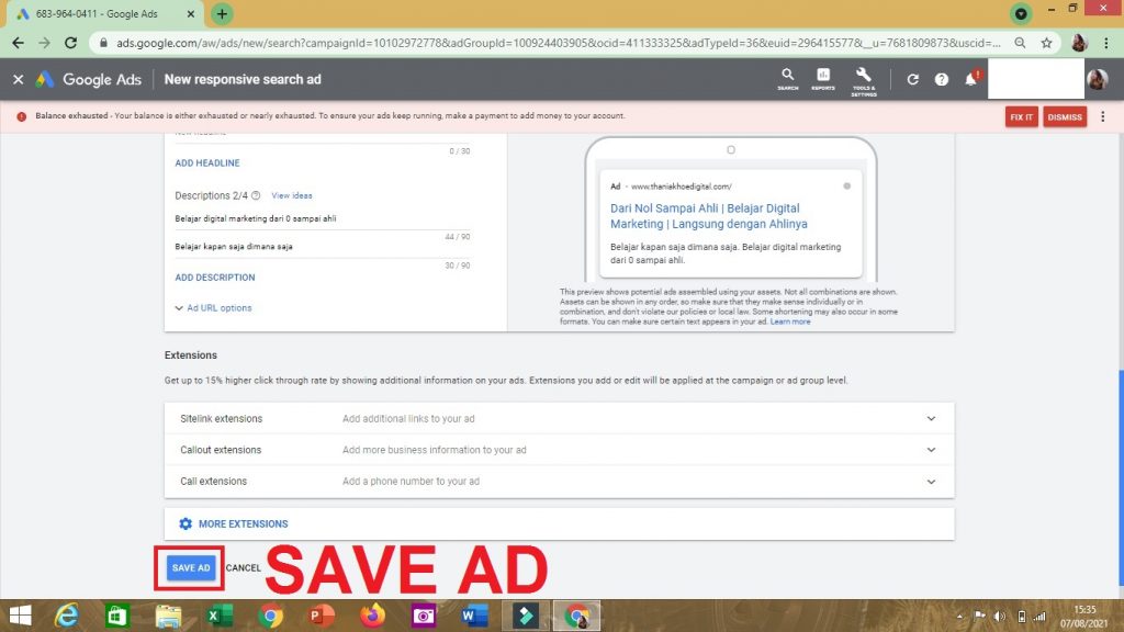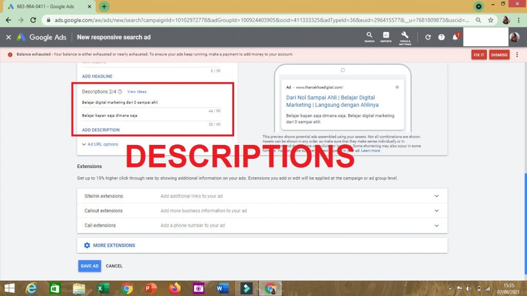 4. Lalu, susunlah struktur iklan: HEADLINE, DESCRIPTIONS, EXTENSIONS dengan Ad Copy yang berbeda. Kemudian SAVE