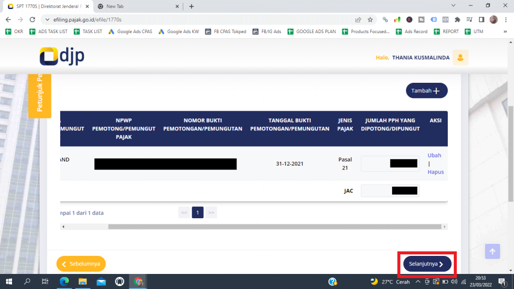 10. Klik Tambah +, di bagian ini isi dengan NPWP tempat kita bekerja, nomor bukti porong, tanggal bukti potong, jenis pajak, dan jumlah Pph