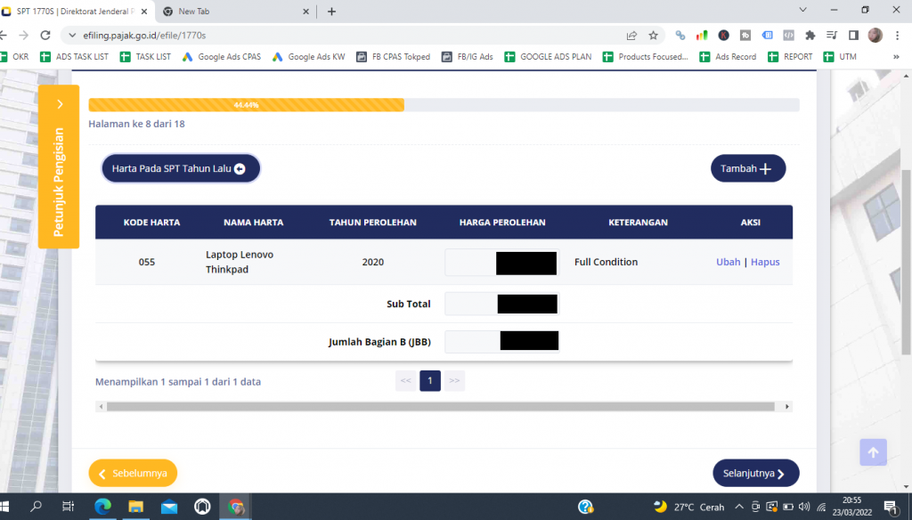 Di bagian harta, jika kamu tidak memiliki harta baru, kamu bisa memasukkan data Harta pada tahun sebelumnya. Untuk mengisinya, pilih Harta Pada SPT Tahun Lalu
