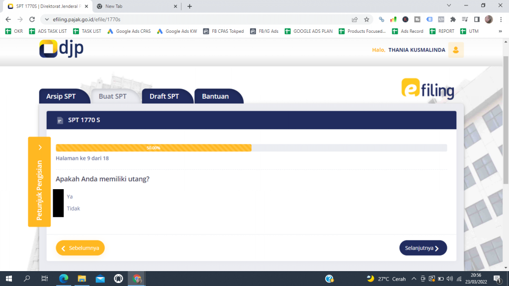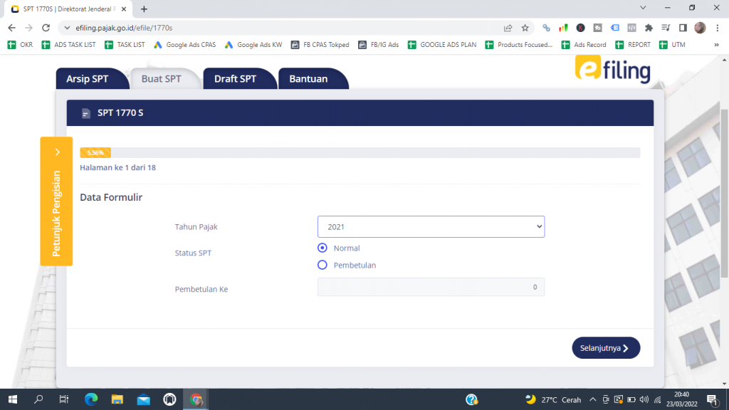 8. Pilih tahun pajak, status SPT normal (jika kamu baru mengisi, bukan ingin memperbaiki) kemudian klik SELANJUTNYA