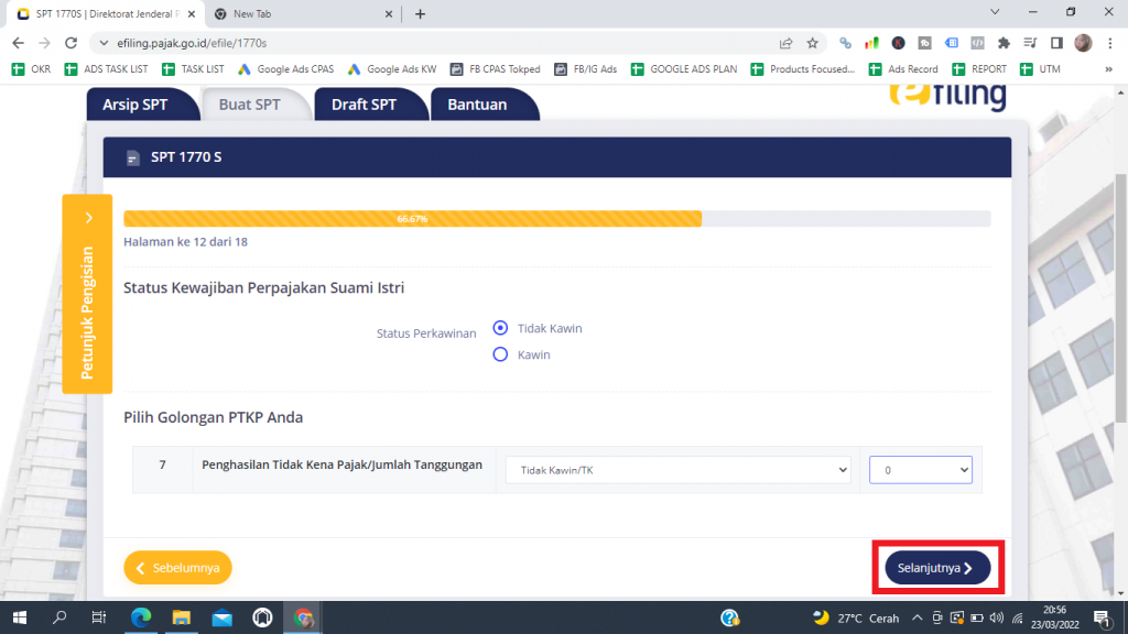Isi status perkawinan (dimana jika belum menikah kita bisa isi dengan Tidak Kawin), kemudian isi golongan PTKP. Jika sudah, klik SELANJUTNYA