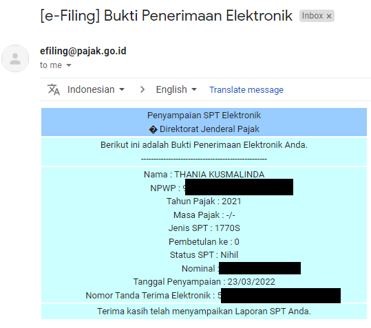 17. Setelah semua proses selesai, kita akan menerima Bukti Penerimaan Elektronik melalui e-mail sebagai bukti jika kita sudah menyampaikan laporan SPT. Check email kamu yah