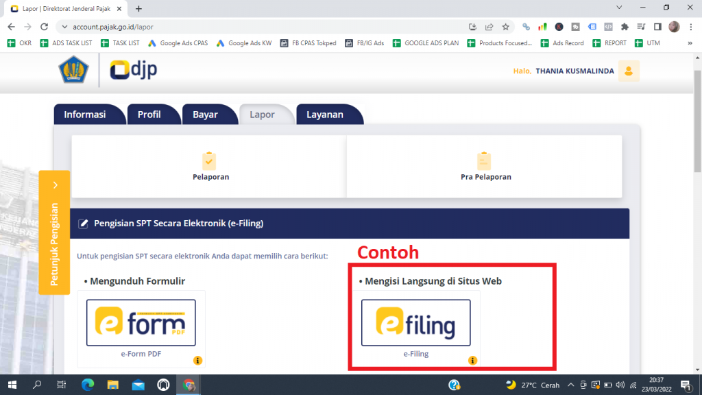 5. Pilih dengan cara apa kita akan mengisi lapor pajak. Untuk mudahnya, sebagai contoh kita pilih e-Filling (mengisi langsung di situs web)