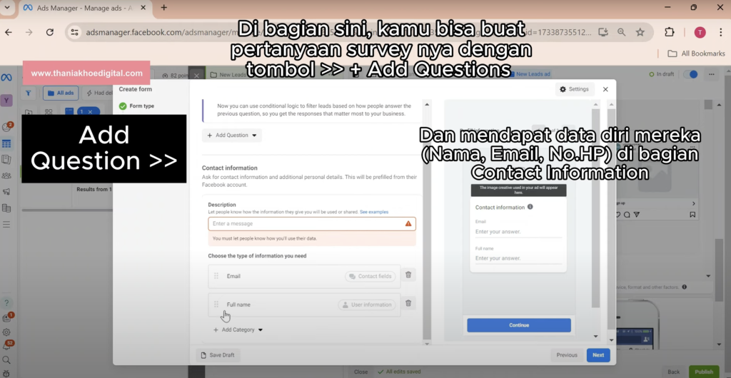 7. Di bagian sini, kita bisa buat list pertanyaan yang ingin “di boost” melalui Meta Ads Instant Form pada bagian “Add Question”, kita juga bisa mengumpulkan data diri mereka seperti Nama, Email, no.HP, dll di bagian Contact Information.