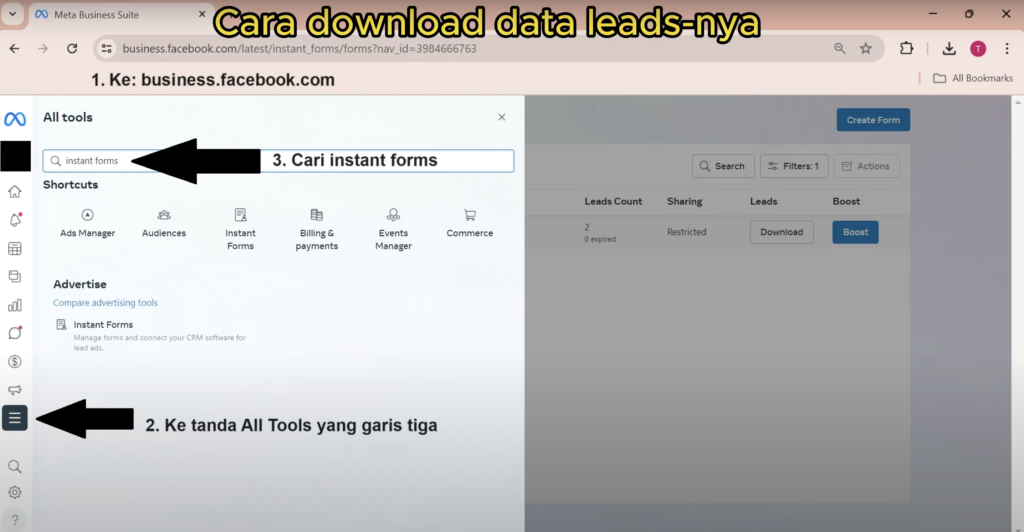 1. Ke Business Manager Facebook (business.facebook.com) melalui link yang ada pada screenshot layar berikut. Ke tanda All Tools yang garis tiga sejajar horizontal, kemudian cari Instant Forms