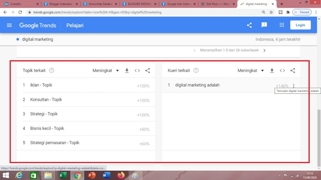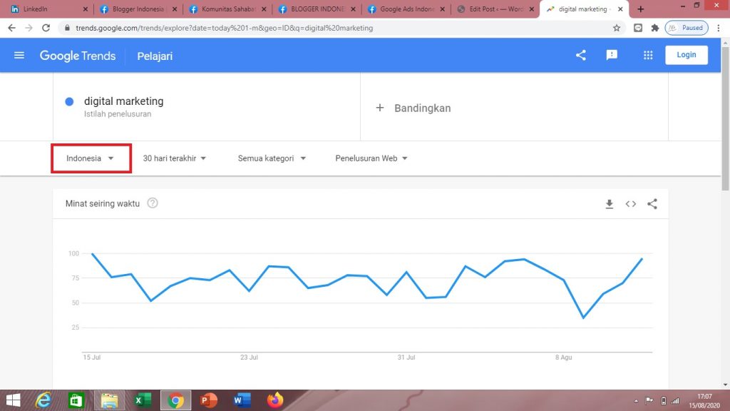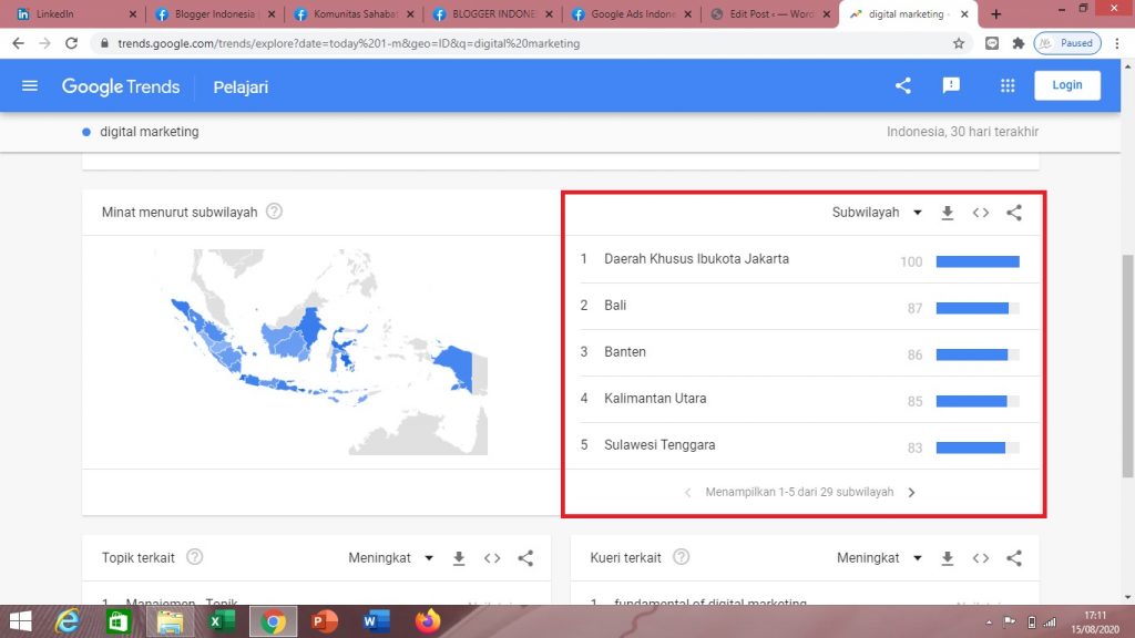 6. Akan terlihar daerah – daerah di mana – mana saja yang banyak membahas digital marketing (topik konten / produk yang ingin kamu riset – kan tadi). Jika kamu ingin berjualan menggunakan Google Ads, hasil riset ini juga bisa membantu targetting – mu!