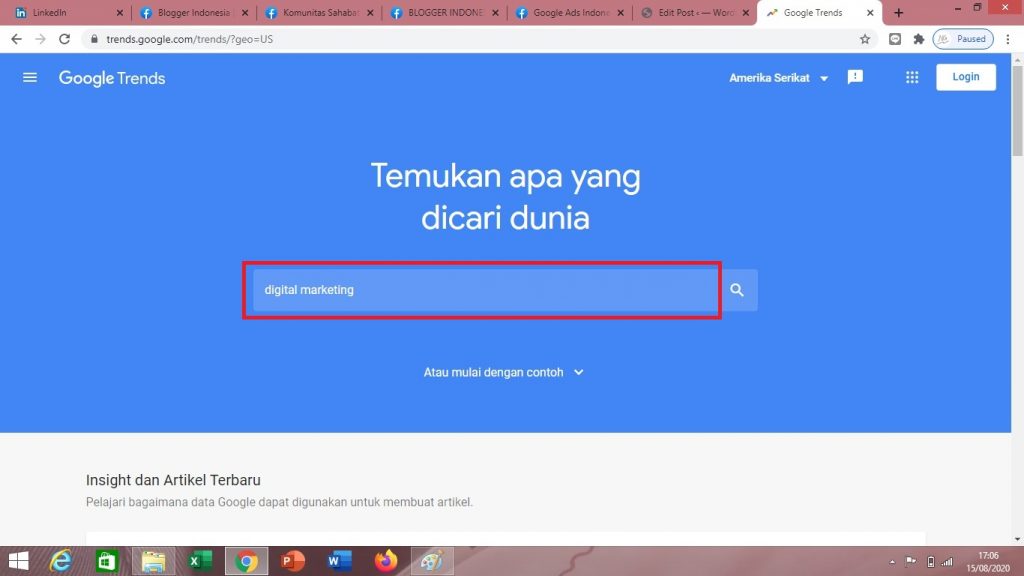 2. Kemudian, ketikkan topik yang ingin kamu riset – kan disini. Misalnya, topik mengenai DIGITAL MARKETING, kemudian tekan ENTER