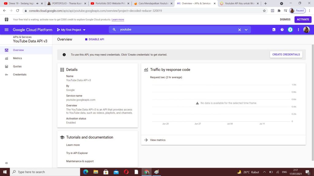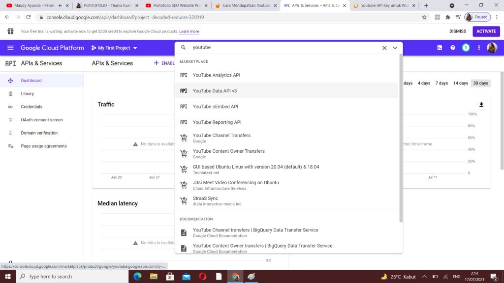 2. Saat sudah masuk di bagian dashboard, carilah: Youtube Data API v3, kemudian enter