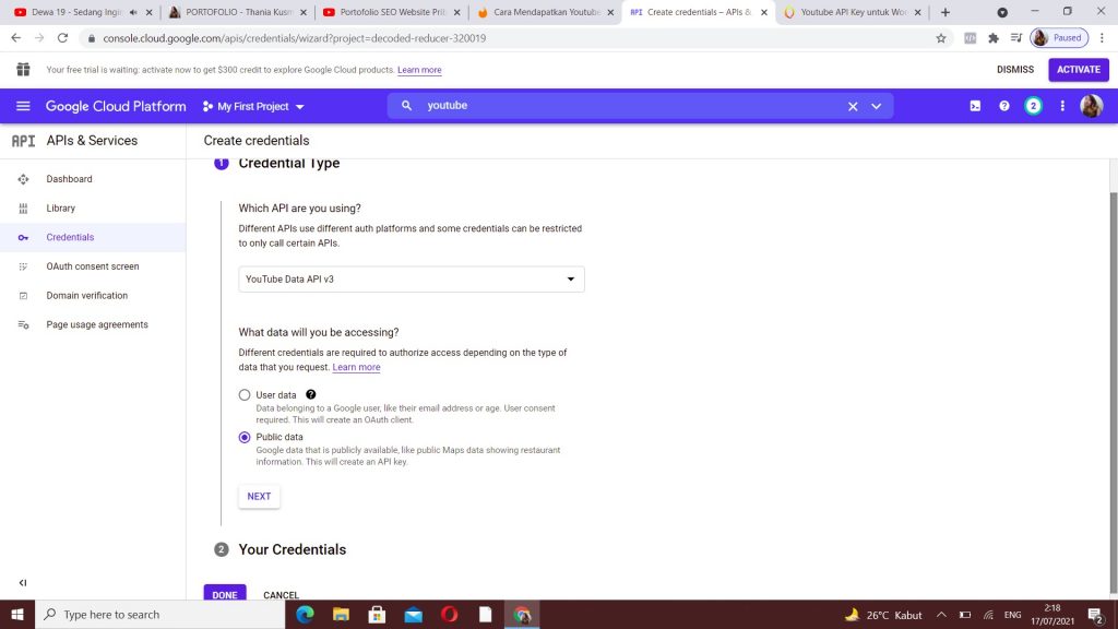 5. Akan tertampil CREDENTIAL TYPE. Di bagian CREDENTIALS, pilihlah “Youtube Data API v3” di bagian Which API are you using. Kemudian, pilih lah jenis data yang ingin kamu gunakan, yaitu USER DATA atau PUBLIC DATA. Kemudian, klik “next”