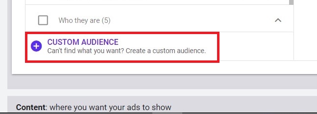 Kemudian, jika kamu scroll ke bagian lebih bawah lagi, kamu akan melihat jenis audience CUSTOM AUDIENCE. Kamu bisa menentukan AUDIENCE yang kamu inginkan berdasarkan apa yang mereka sukai atau apa yang mereka cari di search engine. Kamu bisa klik pada bagian ini. Kamu bisa klik di bagian CUSTOM AUDIENCE (dengan tanda +)