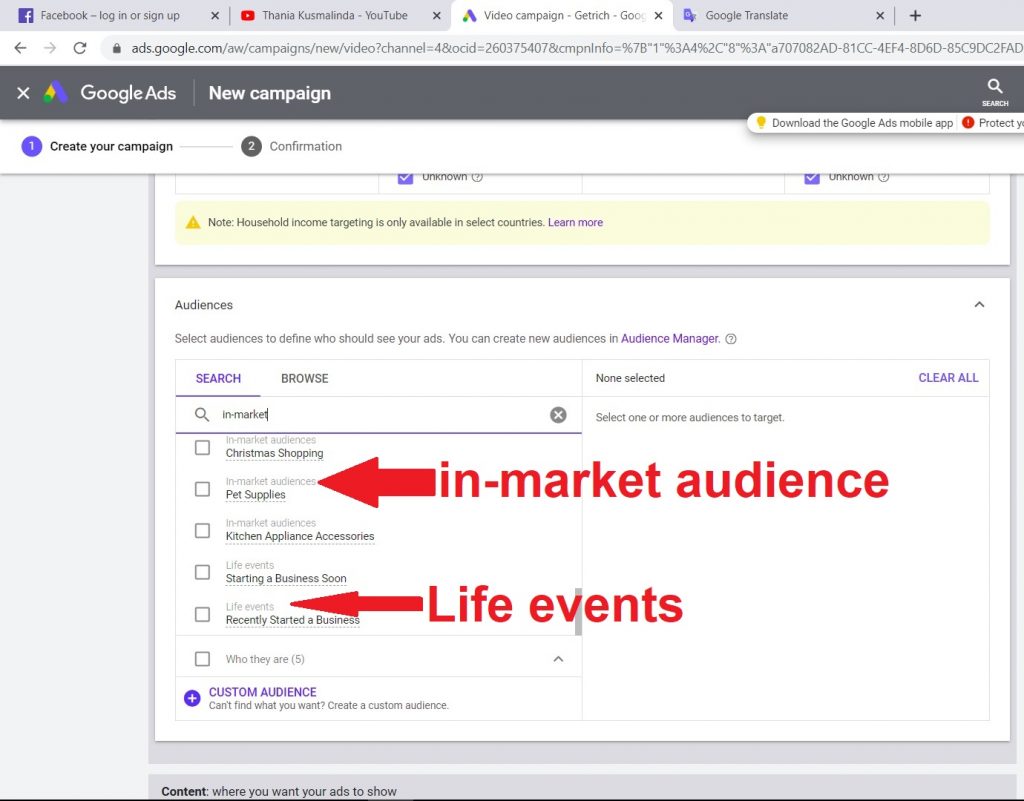 Yang kedua, ada jenis audience IN – MARKET AUDIENCE. Jenis audience ini adalah jenis audience yang aktif dalam mencari sesuatu. Jika mereka tertarik terhadap bisnis, mereka akan mencari tips – tips dalam berbisnis, strategi meningkatkan penjualan, dan lain sebagainya. Juga, IN – MARKET AUDIENCE bisa berarti minat – minat “terbaru” user yang mereka cari di internet. Selain itu, ada audience bernama LIFE EVENTS. BIASANYA, JENIS AUDIENCE IN – MARKET INI MEMILIKI LEBIH BANYAK KONVERSI.