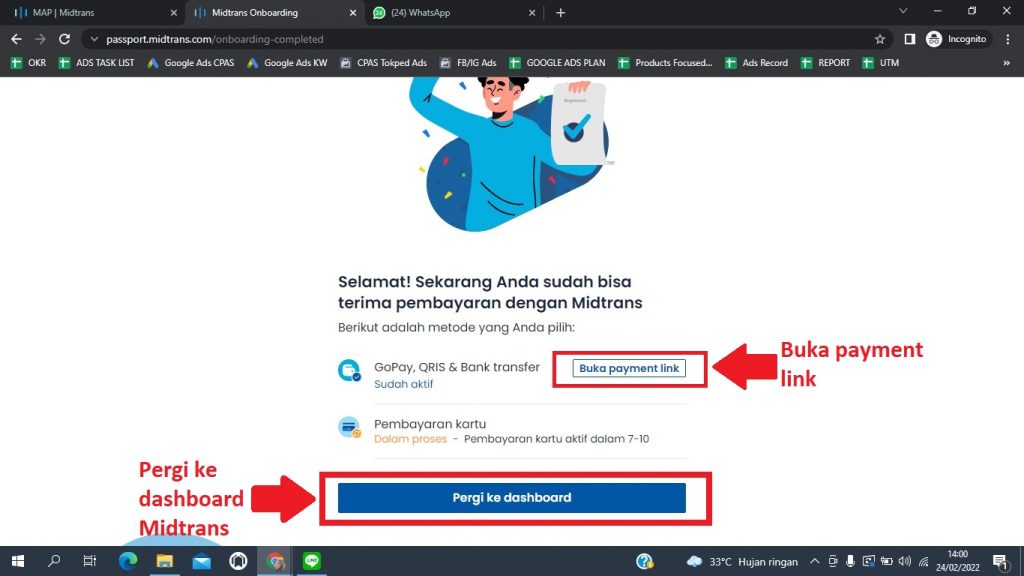 12. Jika sudah, maka kita akan mendapat info payment link, atau bisa kembali ke Dashboard Midtrans