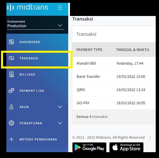 13. Nanti, jika akunnya sudah jadi, untuk mengecek transaksi yang terjadi (pembayaran yang masuk), kita bisa klik ke bagian TRANSAKSI