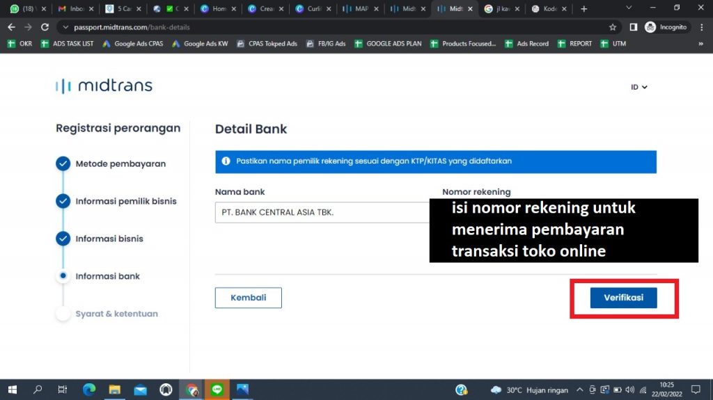 9. Kemudian, isi nomor rekening untuk menerima pembayaran transaksi toko online. Kemudian, klik VERIFIKASI