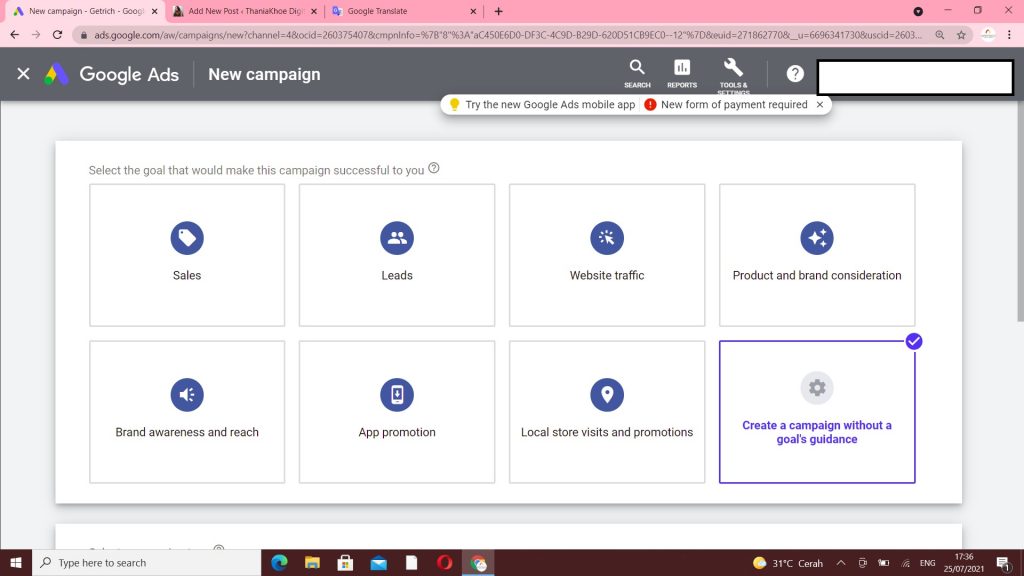 Pertama – tama, saat log in ke google ads (youtube ads merupakan satu bagian dari google ads) di ads.google.com dan membuat campaign baru, kamu akan memilih goal dari ads mu