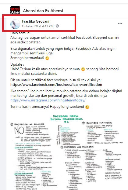 Nah, kemarin ada seorang Digital Marketing Specialist SUPER BAIK di facebook, tepatnya di sebuah group bernama Ahensi dan Ex Ahensi bernama Frastika Geovani yang dengan terbuka membagikan ilmunya. Ia memberikan catatan detail mengenai CAMPAIGN, AD SETS, dan ADS.