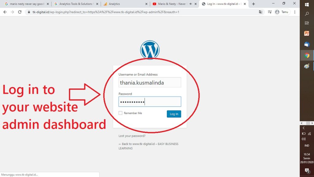 9. LOG IN KE DASHBOARD WEBSITE WORDPRESS KAMU