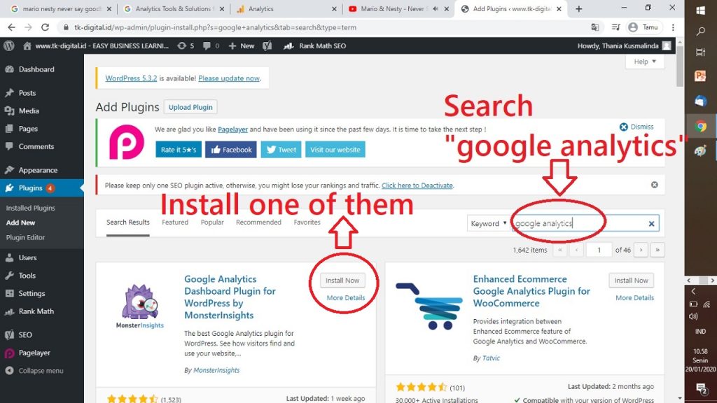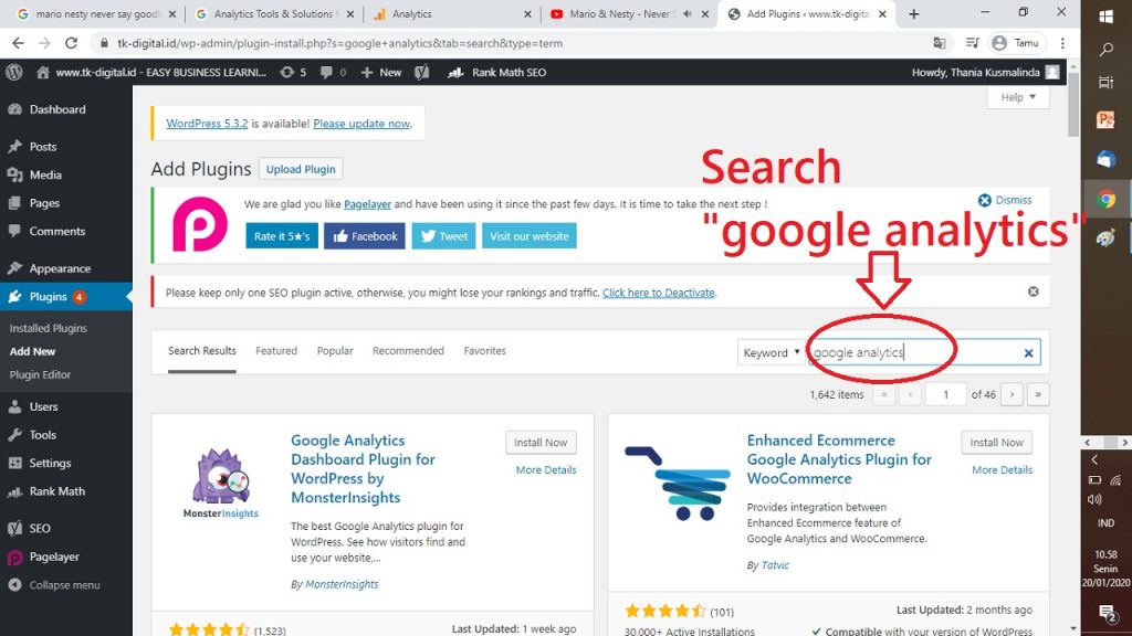 13. SETELAH KETEMU, INSTALL – LAH PLUGIN GOOGLE ANALYTICS OLEH “MONSTERINSIGHTS”