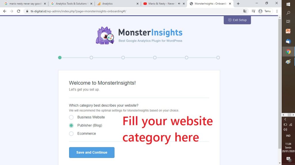 17. SETELAH ITU, AKAN MUNCUL HALAMAN YANG MENGINGINKAN KAMU UNTUK MENGISI JENIS KATEGORI WEBSITE MU. SETELAH ITU, KLIK “SAVE AND CONTINUE” PADA TOMBOL DI BAWAH