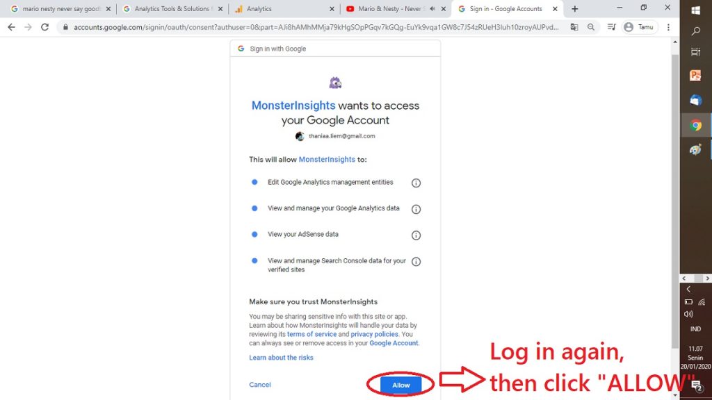 19. MEREKA AKAN MEMINTA KAMU LOG IN KE ACCOUNT MONSTERSIGHTS DENGAN ACCOUNT GOOGLE MU